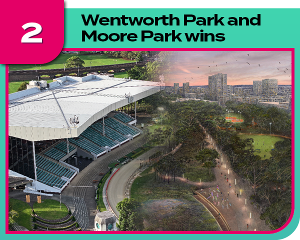 In huge wins for our community, the NSW Government released budgeted plans for the return of 20 hectares of the Moore Park Golf Course to community parkland, and made a firm commitment to return Wentworth Park to us when the lease on the greyhound racing track expires in 2027!